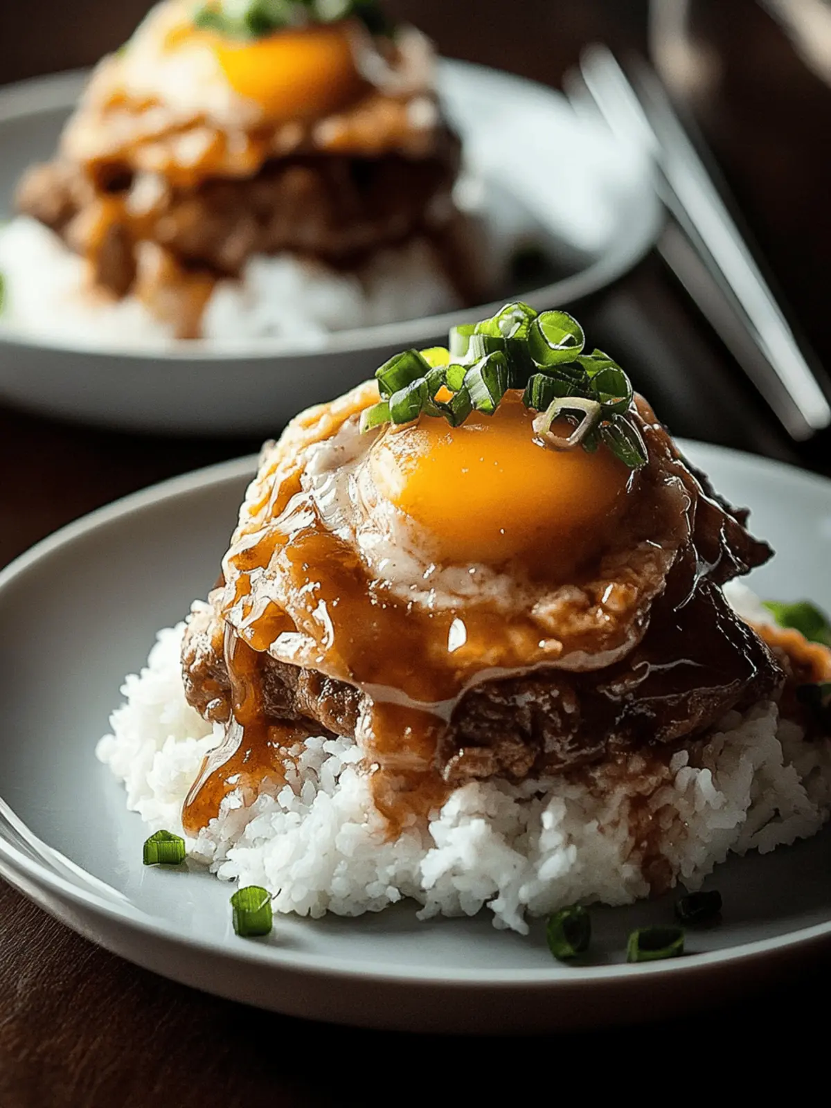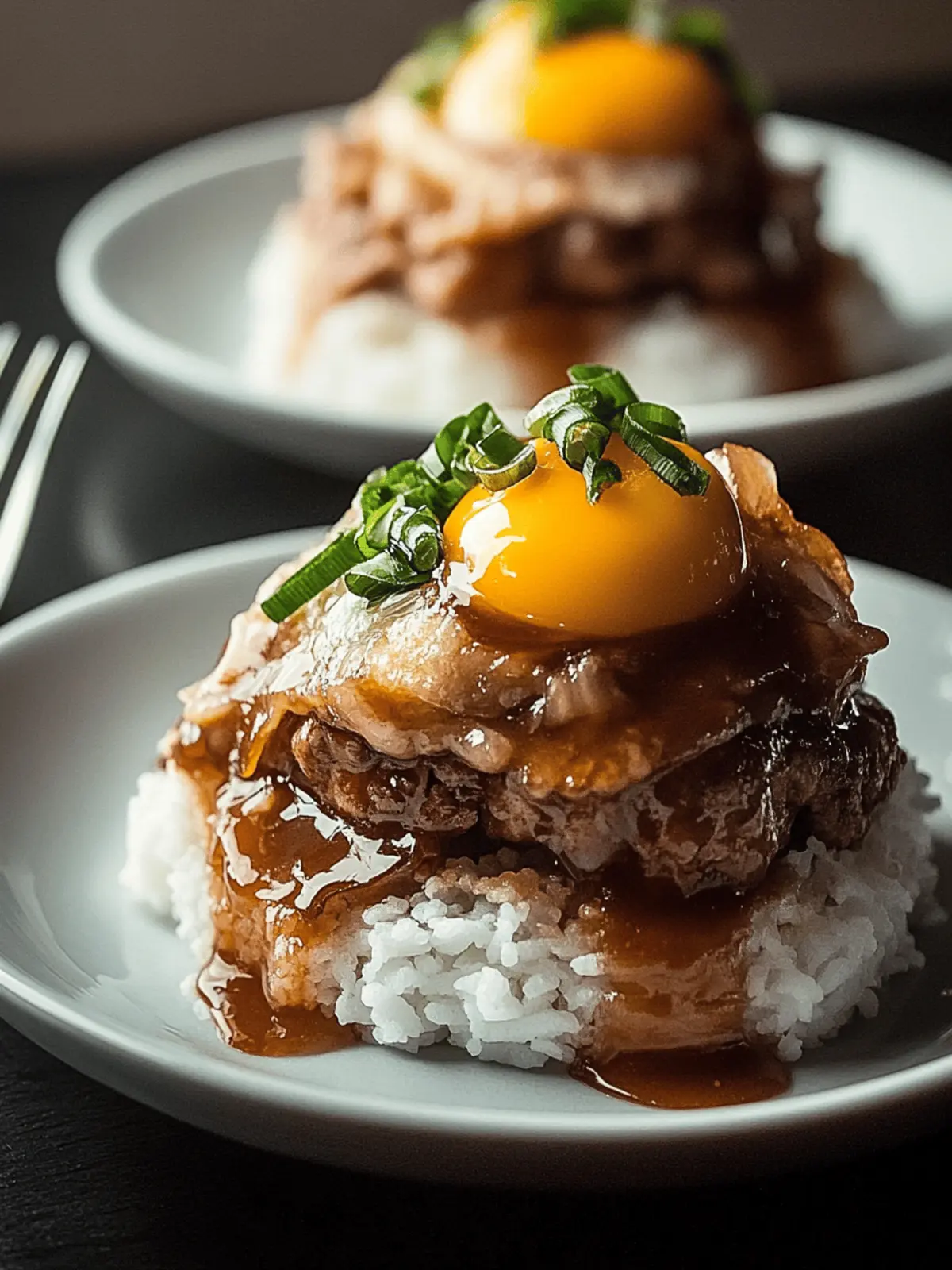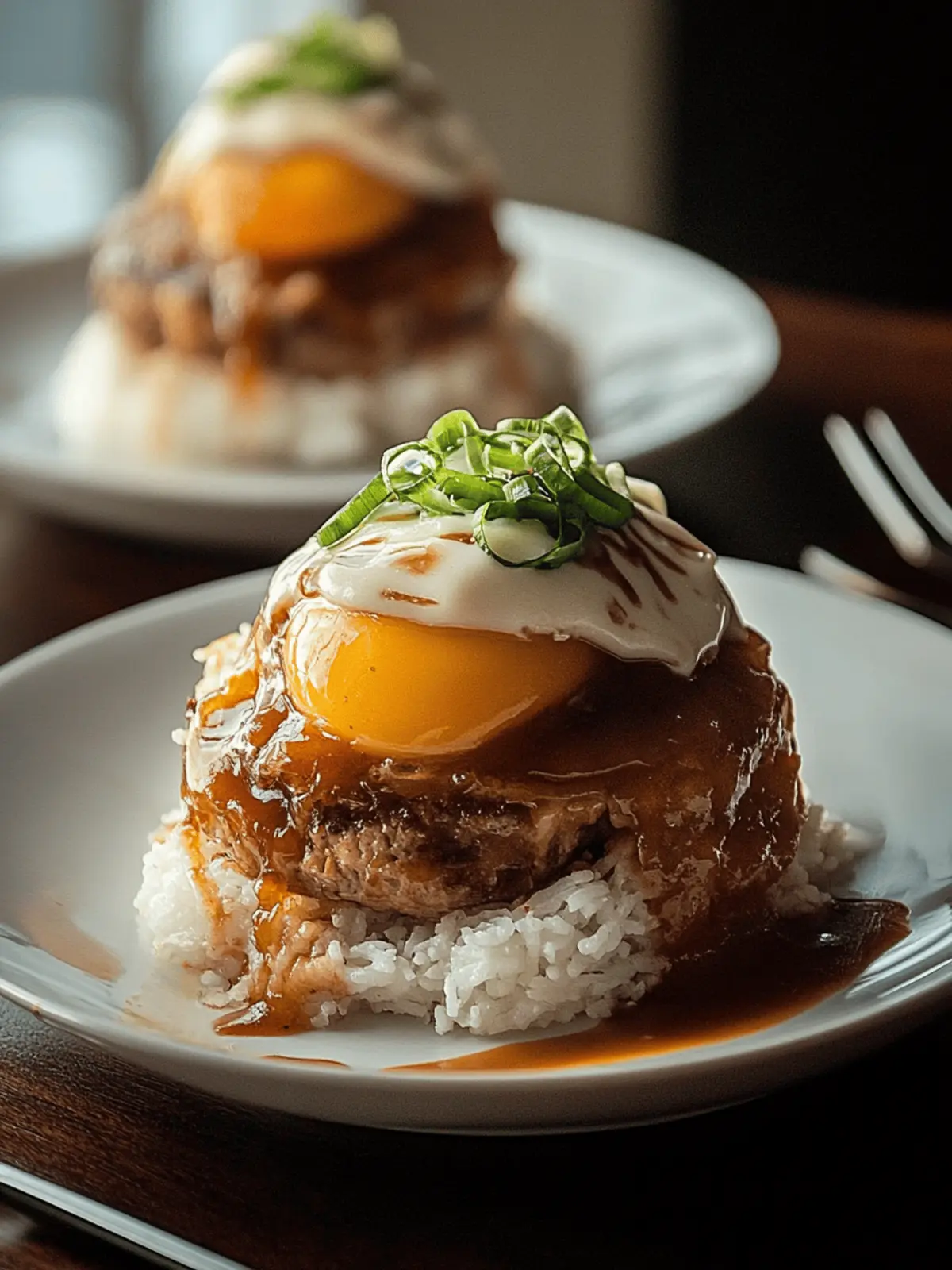 Assemble: On a plate, layer cooked rice, followed by a hamburger patty. Pour the luscious gravy over the patty, then place the fried egg on top. Garnish with green onions for a fresh touch.