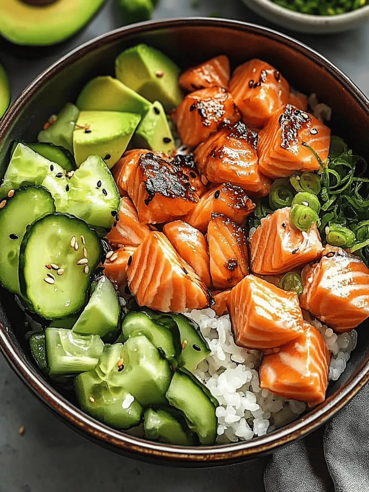 Flavorful Marinades: Experiment with marinades! Adding citrus or herbs can give your Salmon Rice Bowls an extra layer of brightness and depth.